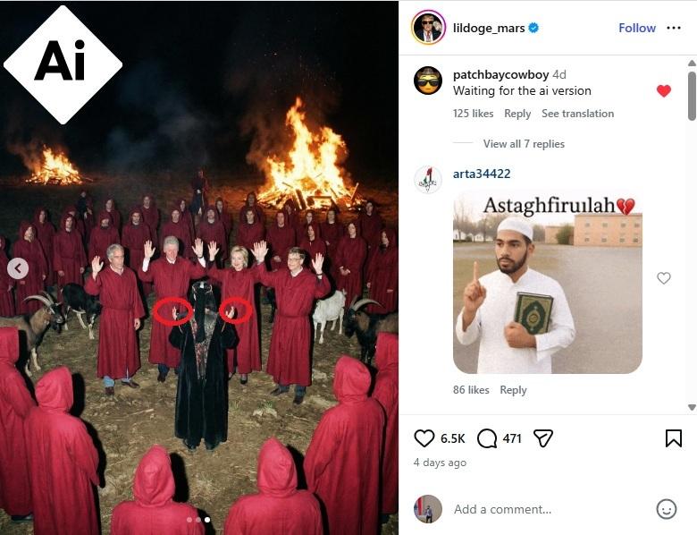 «Σατανιστικές τελετές στο νησί του Έπσταϊν με πολλούς διάσημους, Γκέιτς, Κλίντον κτλ», αναφέρει αυτή η ανάρτηση στο Facebook από τις 7 Φεβρουαρίου 2026, η οποία περιλαμβάνει ένα βίντεο που δείχνει τέσσερις φωτογραφίες του Τζέφρι Έπσταϊν, του Μπιλ Κλίντον, της συζύγου του Χίλαρι ή του Μπιλ Γκέιτς να φορούν κόκκινες κάπες. Η ανάρτηση έχει συγκεντρώσει έκτοτε περισσότερες από 3.300 προβολές.