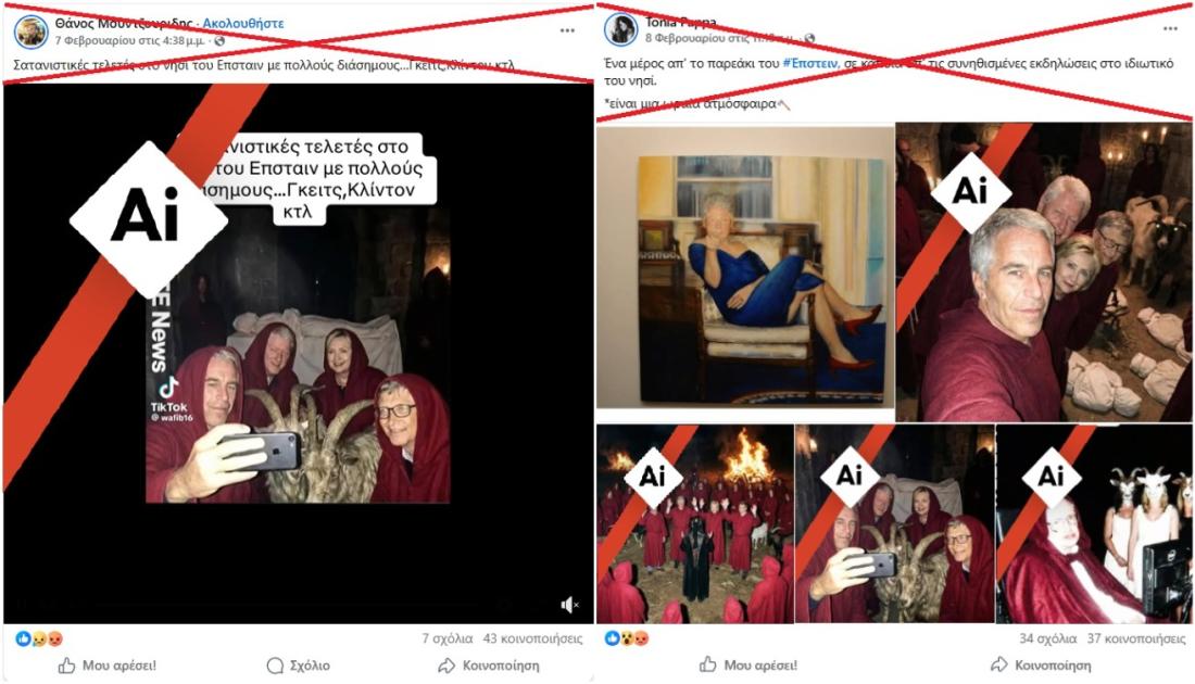 Αφού το Υπουργείο Δικαιοσύνης των ΗΠΑ δημοσίευσε τον Ιανουάριο του 2026 μια νέα σειρά εγγράφων που σχετίζονται με την έρευνα για τον εκλιπόντα καταδικασμένο για σεξουαλικά εγκλήματα Τζέφρι Έπσταϊν, ψευδείς ισχυρισμοί διαδόθηκαν στο διαδίκτυο σε πολλές γλώσσες, συχνά με τη χρήση κατασκευασμένων ή παραποιημένων εικόνων. Το τελευταίο παράδειγμα στα ελληνικά ήταν η κυκλοφορία τεσσάρων εικόνων που έδειχναν τον Έπσταϊν με τον Μπιλ Γκέιτς, τον Στίβεν Χόκινγκ, τον Μπιλ Κλίντον και τη Χίλαρι Κλίντον να συμμετέχουν σε τελετουργίες στο νησί του Έπσταϊν, υποτίθεται ως απόδειξη των δεσμών τους μαζί του. Μια ανάλυση του AFP διαπίστωσε ότι οι εικόνες δημιουργήθηκαν με τεχνητή νοημοσύνη (AI) και έφεραν ένα υδατογράφημα AI.