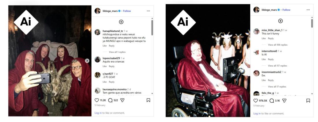 Ενώ πολλοί χρήστες σχολίασαν ότι οι εικόνες είναι ψεύτικες, αρκετοί άλλοι πίστεψαν ότι είναι αληθινές. «Τι σου κάνουν τα λεφτά και η φήμη», έγραψε για παράδειγμα ένας χρήστης. «Παιδιά του διαβόλου. Αυτοί κυβερνούν σχεδόν όλες τις χώρες», σχολίασε ένας άλλος. Ένας χρήστης έγραψε ότι «μπορεί να είναι AI αλλα δεν είναι μακριά από την πραγματικότητα».