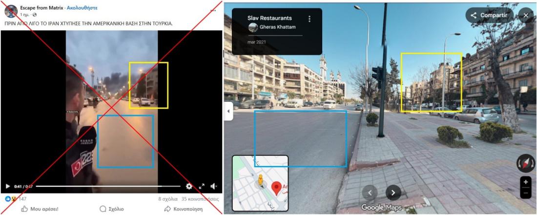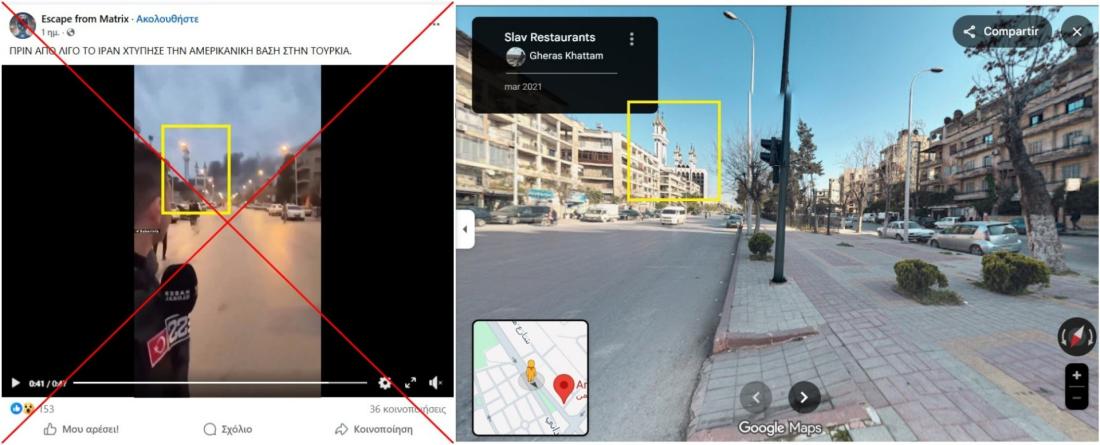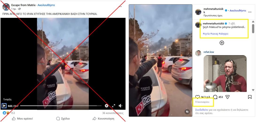 Μετά τις επιθέσεις του Ιράν εναντίον χωρών του Κόλπου που φιλοξενούν αμερικανικές βάσεις ως απάντηση στις αεροπορικές επιδρομές ΗΠΑ-Ισραήλ στις 28 Φεβρουαρίου 2026, άρχισαν να κυκλοφορούν στο διαδίκτυο ψευδείς ισχυρισμοί σε πολλές γλώσσες. Στην Ελλάδα, χρήστες των μέσων κοινωνικής δικτύωσης κοινοποίησαν ένα βίντεο το οποίο στην πραγματικότητα είχε τραβηχτεί στη Συρία, ισχυριζόμενοι ότι δείχνει ιρανική επίθεση σε αμερικανική βάση στην Τουρκία. Το AFP κατάφερε να εντοπίσει τη γεωγραφική τοποθεσία του βίντεο, διαπιστώνοντας ότι απεικονίζει μια συνοικία στο Χαλέπι κατά τη διάρκεια συγκρούσεων μεταξύ του συριακού στρατού και κουρδικών δυνάμεων τον Ιανουάριο του 2026. Ο δημοσιογράφος που εμφανίζεται στο βίντεο επιβεβαίωσε, επίσης, ότι αυτό δεν σχετίζεται με την Τουρκία.