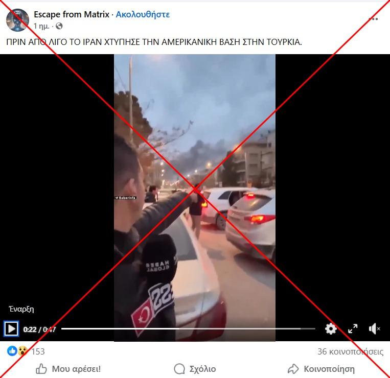 «ΠΡΙΝ ΑΠΟ ΛΙΓΟ ΤΟ ΙΡΑΝ ΧΤΥΠΗΣΕ ΤΗΝ ΑΜΕΡΙΚΑΝΙΚΗ ΒΑΣΗ ΣΤΗΝ ΤΟΥΡΚΙΑ», αναφέρει αυτή η ανάρτηση στο Facebook από τις 2 Μαρτίου 2026, η οποία περιλαμβάνει ένα βίντεο 47 δευτερολέπτων που δείχνει έναν άνδρα ο οποίος φέρεται να είναι δημοσιογράφος και να τραβάει ο ίδιος το βίντεο, με το σύμβολο της τουρκικής σημαίας. Ο δημιοσιογράφος μοιάζει να κάνει ρεπορτάζ από μια περιοχή με ορατό καπνό.