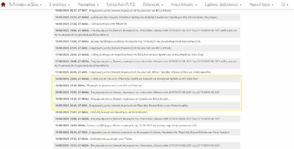 Εξετάζοντας τα δελτία τύπου, καθώς και τις ανακοινώσεις στην ιστοσελίδα του Πυροσβεστικού Σώματος, με τις οποίες το κοινό ενημερώνεται για τις επιχειρήσεις της πυροσβεστικής, βλέπουμε πως κανένα τέτοιο συμβάν δεν έχει καταγραφεί στις 16 Αυγούστου 2021. Για ένα παρόμοιο fact check, τα Ellinika Hoaxes εξέτασαν επίσης τα συστήματα Copernicus και FIRMS, που παρακολουθούν τις πυρκαγιές, και διαπίστωσαν ότι ούτε και εκείνα είχαν καταγράψει κάποιο τέτοιο συμβάν κατά το επίμαχο διάστημα.