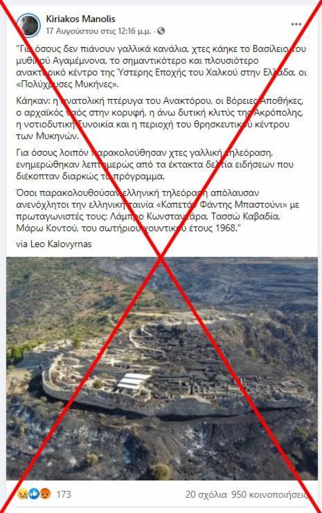 «Για όσους δεν πιάνουν γαλλικά κανάλια, χτες κάηκε το Βασίλειο του μυθικού Αγαμέμνονα, το σημαντικότερο και πλουσιότερο ανακτορικό κέντρο της Ύστερης Εποχής του Χαλκού στην Ελλάδα, οι "Πολύχρυσες Μυκήνες"», αναφέρει μια ανάρτηση που έγινε στο Facebook στις 17 Αυγούστου 2021 και έχει κοινοποιηθεί περισσότερες από 2.500 φορές έκτοτε, σύμφωνα με δεδομένα του Facebook.