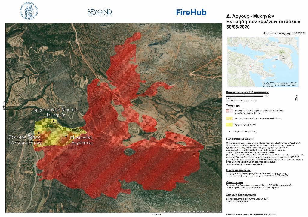 Σύμφωνα με έκθεση που δημοσιεύθηκε στις 7 Σεπτεμβρίου 2020 από το Εθνικό Αστεροσκοπείο Αθηνών, η φωτιά κατέκαψε 1.140 στρέμματα. Η έκθεση αναφέρει ότι ο τόπος δεν είχε καεί ποτέ στο εγγύς παρελθόν, από το 1984 που πραγματοποιείται η σχετική επιτήρηση κι έπειτα. Στην εικόνα που ακολουθεί, η συνολική καμένη έκταση σημειώνεται με κόκκινο χρώμα, ενώ τα όρια του επισκέψιμου αρχαιολογικού χώρου, όπως ορίζονται ανατολικά της τοπικής οδού που οδηγεί στην είσοδο του χώρου, σημειώνονται με κίτρινο χρώμα.