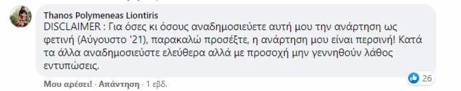 Ο χρήστης του Facebook έχει προσθέσει τη διευκρίνιση και στα σχόλια της ανάρτησής του, καλώντας τους άλλους χρήστες του Facebook να λάβουν υπόψη τους το γεγονός ότι η ανάρτησή του έγινε πέρυσι. «Κατά τα άλλα αναδημοσιεύστε ελεύθερα αλλά με προσοχή μην γεννηθούν λάθος εντυπώσεις», αναφέρει ο χρήστης. .