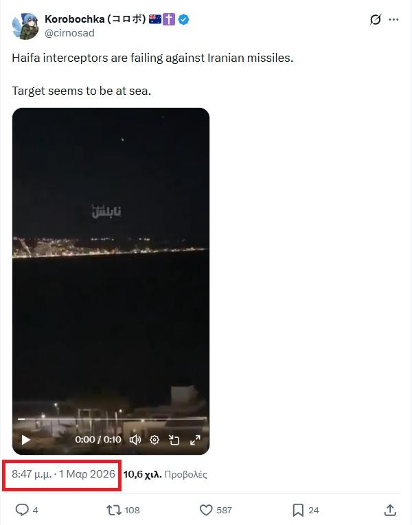 Αντίστροφες αναζητήσεις εικόνας χρησιμοποιώντας βασικά καρέ από το βίντεο οδήγησαν σε δύο αναρτήσεις στο X (εδώ και εδώ), δημοσιευμένες στις 8:47 μ.μ. (EET, UTC+2) την 1η Μαρτίου 2026, υποδηλώνοντας ότι το βίντεο δείχνει τη Χάιφα στο Ισραήλ.