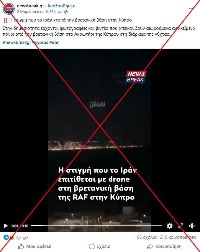 «Η στιγμή που το Ιράν χτυπά την βρετανική βάση στην Κύπρο. Στην δημοσιότητα έρχονται φωτογραφίες και βίντεο που απεικονίζουν αιωρούμενα αντικείμενα πάνω από την βρετανική βάση στο Ακρωτήρι της Κύπρου στη διάρκεια της νύχτας», γράφει αυτή η ανάρτηση στο Facebook από τις 2 Μαρτίου 2026, η οποία έκτοτε έχει κοινοποιηθεί περισσότερες από 200 φορές και έχει συγκεντρώσει περισσότερες από 782.000 προβολές.