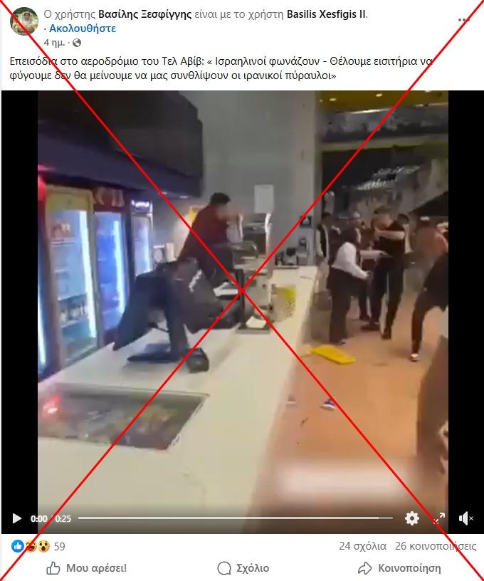 «Επεισόδια στο αεροδρόμιο του Τελ Αβίβ: "Ισραηλινοί φωνάζουν - Θέλουμε εισιτήρια να φύγουμε δεν θα μείνουμε να μας συνθλίψουν οι ιρανικοί πύραυλοι"», αναφέρει αυτή η ανάρτηση στο Facebook από τις 12 Μαρτίου 2026, η οποία περιλαμβάνει ένα βίντεο διάρκειας 25 δευτερολέπτων που δείχνει μια χαοτική σκηνή μέσα σε μια αίθουσα, με ανθρώπους να φωνάζουν και να πετάνε αντικείμενα σε μέλη του προσωπικού που στέκονται πίσω από κάτι που μοιάζει με γκισέ. Η ανάρτηση έχει συγκεντρώσει έκτοτε περισσότερες από 9.000 προβολές.