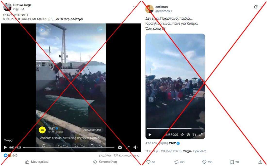 «Δεν είναι Πακιστανοί παιδιά... Ισραηλινοί είναι, πάνε για Κύπρο», αναφέρει αυτή η ανάρτηση στο X από τις 20 Μαρτίου 2026, η οποία περιλαμβάνει ένα βίντεο διάρκειας 22 δευτερολέπτων που δείχνει πολλούς ανθρώπους να σπεύδουν να επιβιβαστούν σε ένα πλοίο. Ο ισχυρισμός κοινοποιήθηκε περισσότερες από 660 φορές στα ελληνικά σε πλατφόρμες όπως το X και το Facebook.