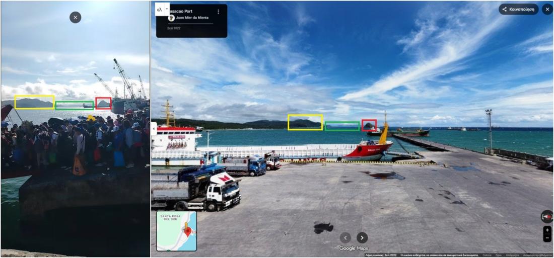 Χρησιμοποιώντας τους Χάρτες Google, εντοπίσαμε ομοιότητες μεταξύ του ορεινού φόντο στο κοινοποιημένο βίντεο και εικόνων από το λιμάνι Πασακάο που δημοσιεύτηκαν τον Σεπτέμβριο του 2022 (αρχειοθετημένο εδώ).