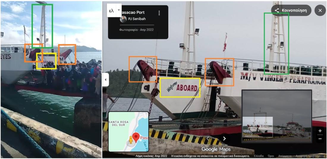 Στο ίδιο σημείο στους Χάρτες Google, το AFP βρήκε μια εικόνα που κοινοποιήθηκε τον Απρίλιο του 2022 (αρχειοθετημένη εδώ), με ένα πλοίο που μοιάζει πολύ με αυτό στο κοινοποιημένο βίντεο, με το οποίο έχουν κοινά στοιχεία, όπως οι λέξεις «Welcome Aboard» και οι κόκκινες λεπτομέρειες κατά μήκος των άκρων του πλοίου.