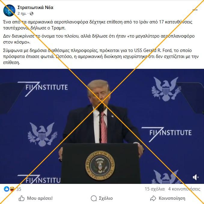 «Ένα από τα αμερικανικά αεροπλανοφόρα δέχτηκε επίθεση από το Ιράν από 17 κατευθύνσεις ταυτόχρονα, δήλωσε ο Τραμπ. Δεν διευκρίνισε το όνομα του πλοίου, αλλά δήλωσε ότι ήταν "το μεγαλύτερο αεροπλανοφόρο στον κόσμο"», αναφέρει αυτή η ανάρτηση στο Facebook από τις 28 Μαρτίου 2026, κοινοποιώντας ένα βίντεο διάρκειας 39 δευτερολέπτων, στο οποίο ο πρόεδρος των ΗΠΑ, Ντόναλντ Τραμπ, εκφωνεί έναν λόγο. Στο βίντεο, ο Τραμπ περιγράφει μια σκηνή στην οποία ένα γρήγορο αεροσκάφος απογειώνεται από το μεγαλύτερο αεροπλανοφόρο του κόσμου κάθε 32 δευτερόλεπτα περίπου στη 1:00 π.μ., κάνοντας τους ανθρώπους να αντιληφθούν ότι υπάρχει πρόβλημα και να αισθανθούν ότι δέχονται επίθεση από 17 διαφορετικές κατευθύνσεις και πρέπει να τρέξουν για τη ζωή τους.