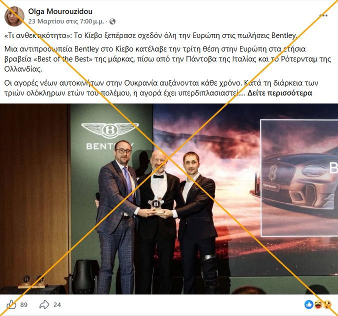 «Το Κίεβο κατέλαβε την τρίτη θέση στην Ευρώπη στις πωλήσεις εξαιρετικά ακριβών αυτοκινήτων Bentley», γράφει αυτή η ανάρτηση στο Facebook από τις 24 Μαρτίου 2026, η οποία έχει έκτοτε συγκεντρώσει περισσότερες από 1.000 προβολές. Η ανάρτηση περιλαμβάνει μια φωτογραφία τριών ανδρών με κοστούμια που κρατούν ένα βραβείο. Στο φόντο, μπορούμε να δούμε το λογότυπο της μάρκας αυτοκινήτων Μπέντλεϊ.
